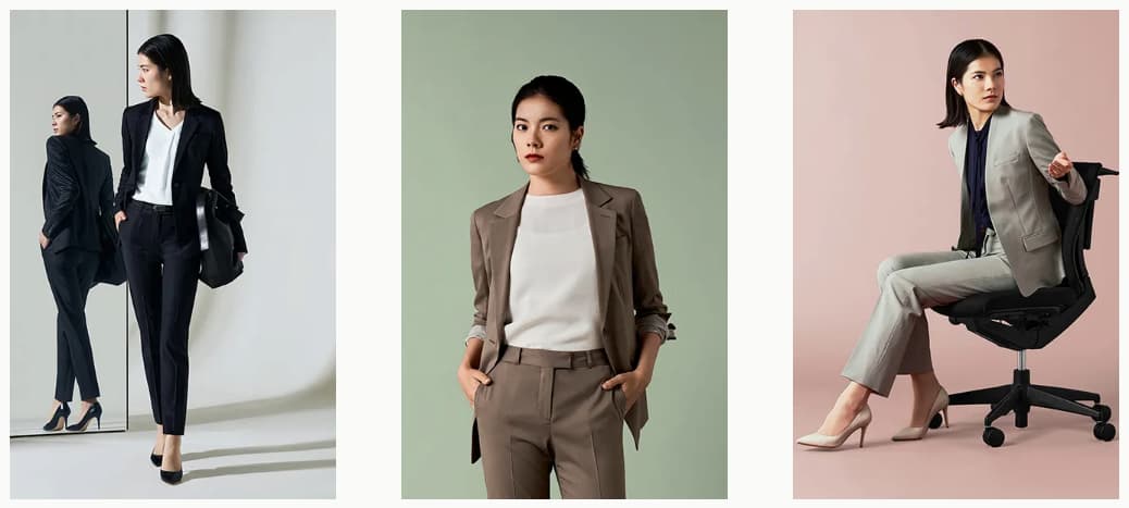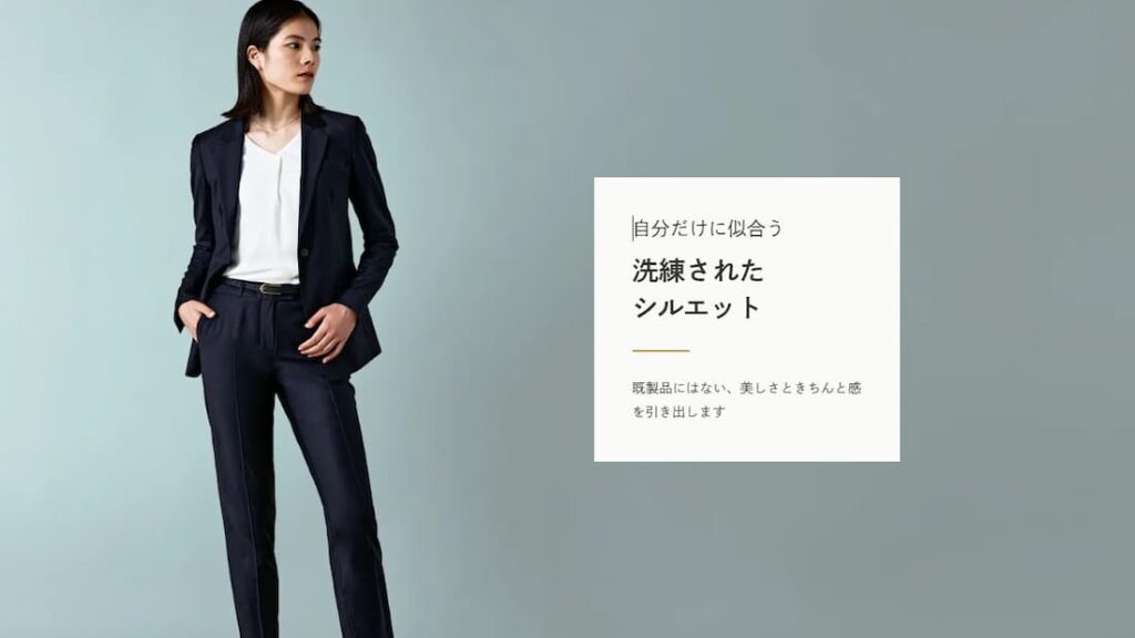 | 価格(税込み) | ・パンツスーツ:49,800円〜 ・ジャケット:35,800円〜 ・スラックス:16,800円〜 |