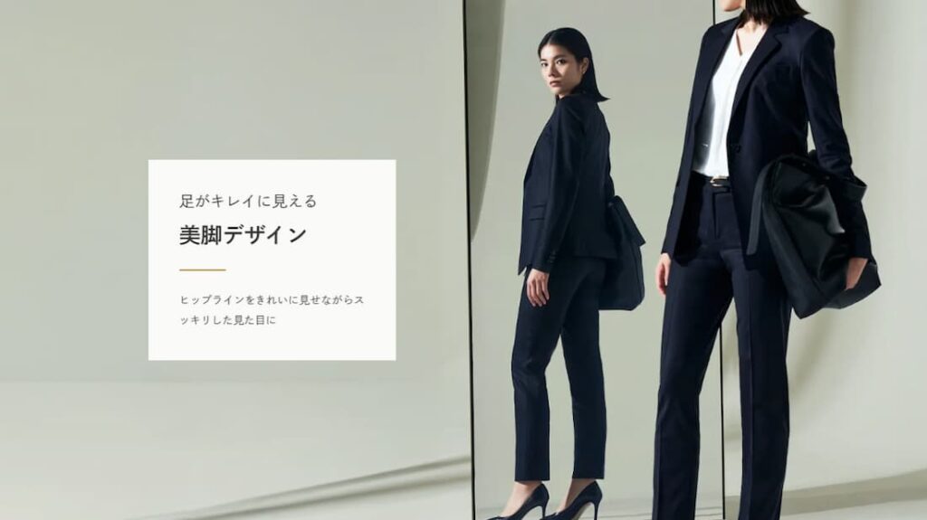 FABRIC TOKYOのレディーススーツは、脚が長く見えるパンツラインが特徴。