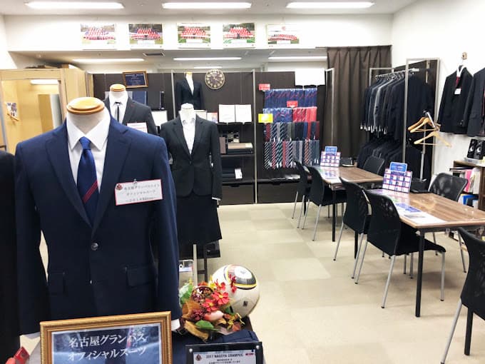 名古屋グランパスのオフィシャル店舗でもあり、選手と同じモデルのスーツやネクタイを手に入れられます。