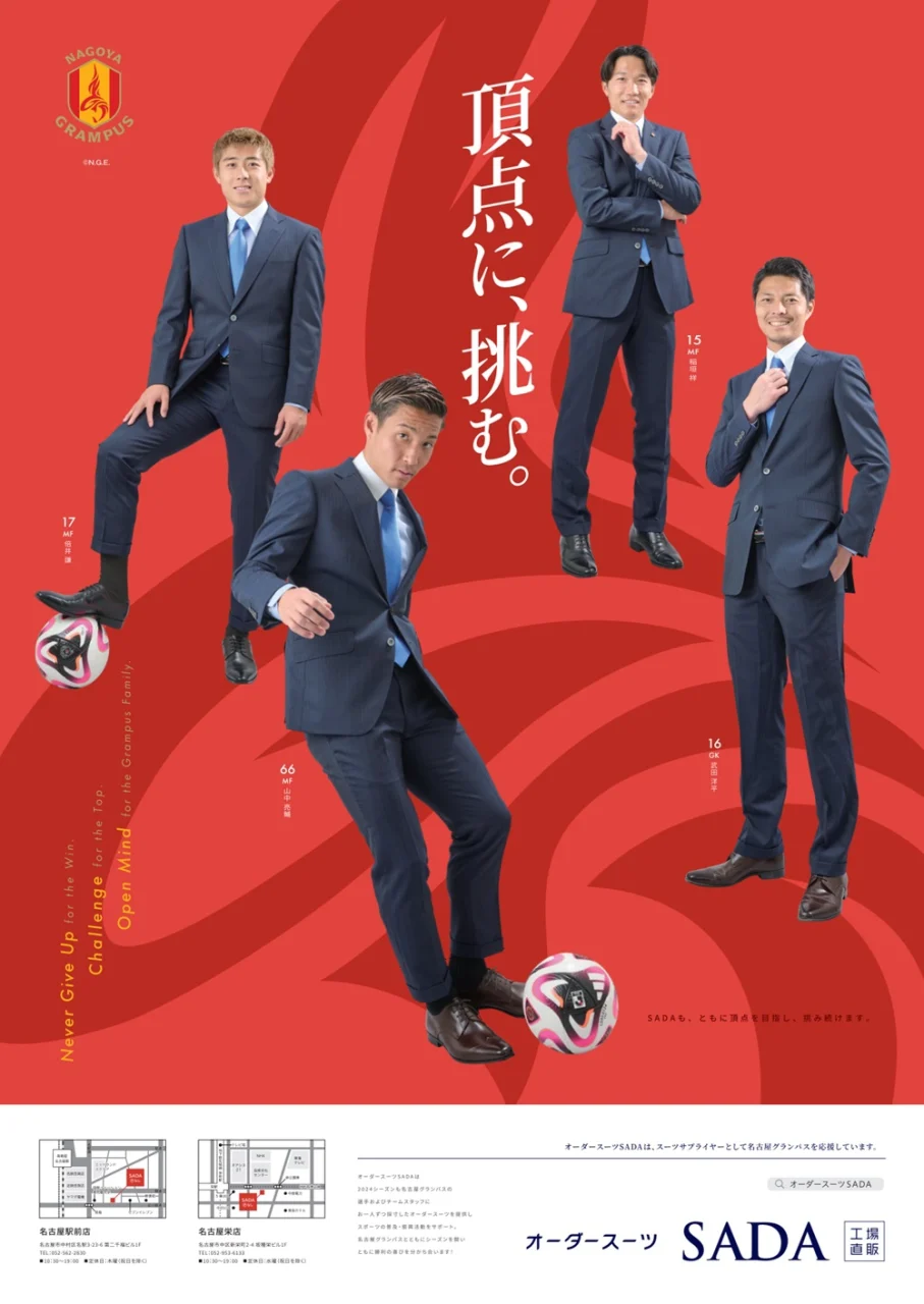 SADA 名古屋栄店では、名古屋グランパスエイトの公式コラボスーツをオーダー可能。