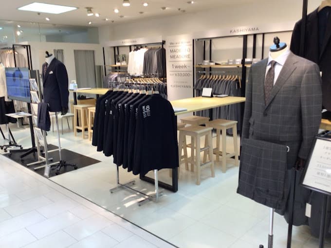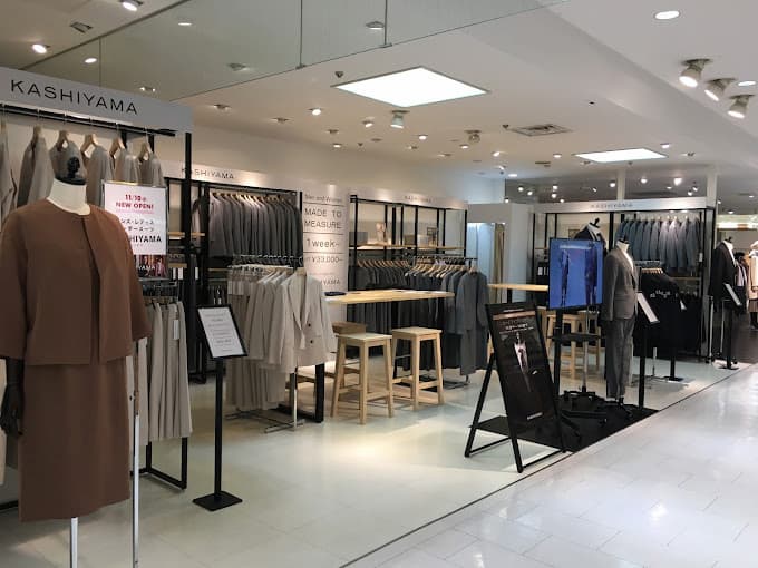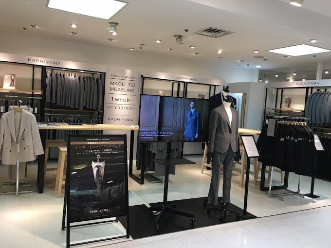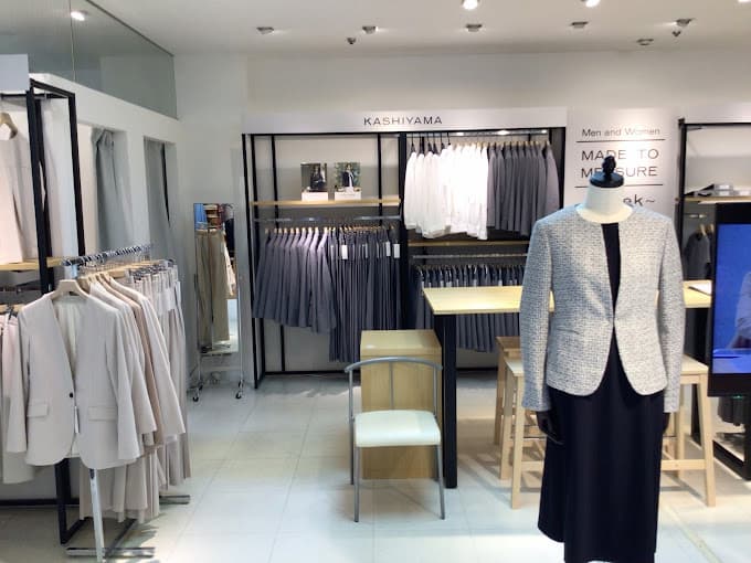 百貨店「大和香林坊」の3FにあるKASHIYAMA 大和香林坊店は、開放的な空間でゆっくりとオーダースーツ選びを楽しめる人気の店舗です。