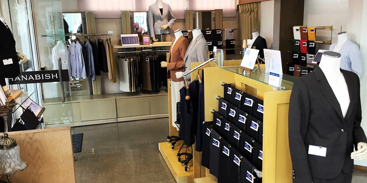 HANABISHI 盛岡店は、専門知識を持つスタッフが丁寧に対応し、豊富な生地から選べるオーダースーツを提供しています。