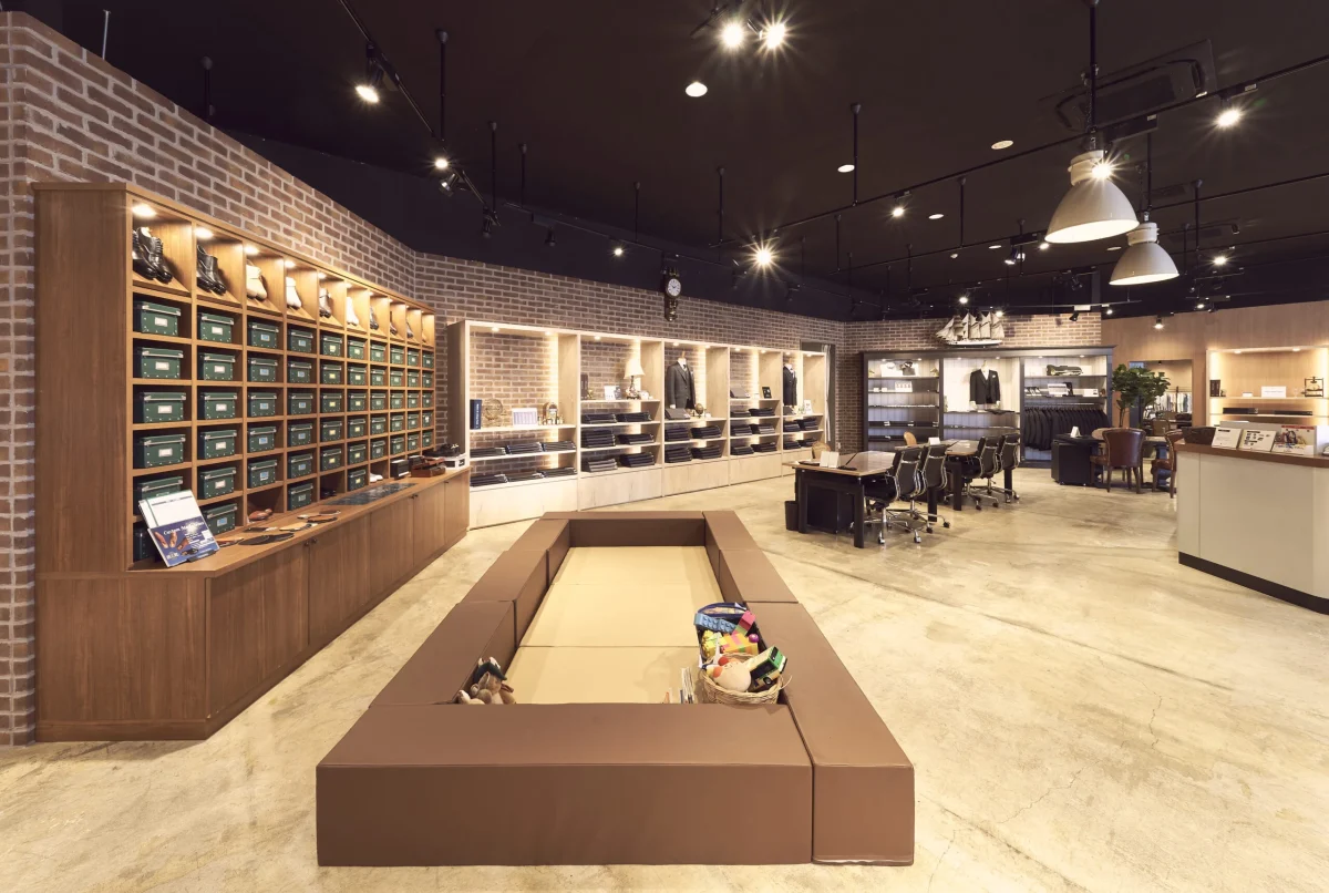 HANABISHI 岩槻加倉店は、100坪を超える広々とした店内で、豊富な生地やオーダーシューズのラインナップを取り揃えています。