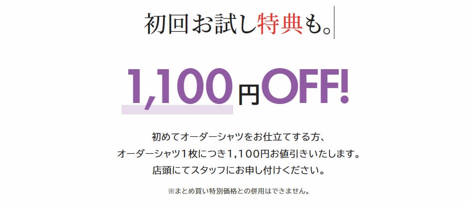 1枚につき、1,100円も割引きしてくれるので、自分だけのオーダーシャツを気軽に体験できます。