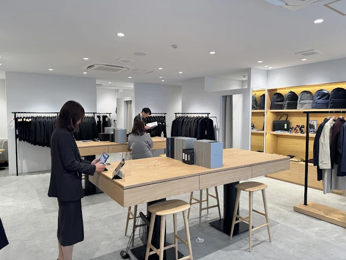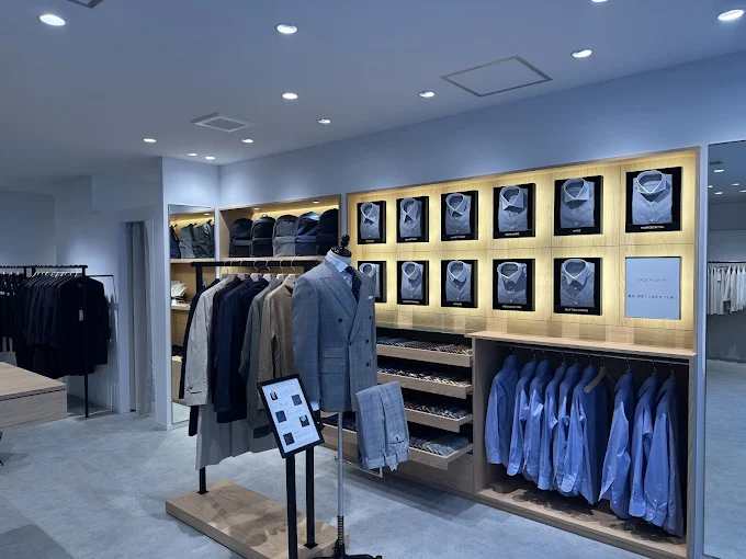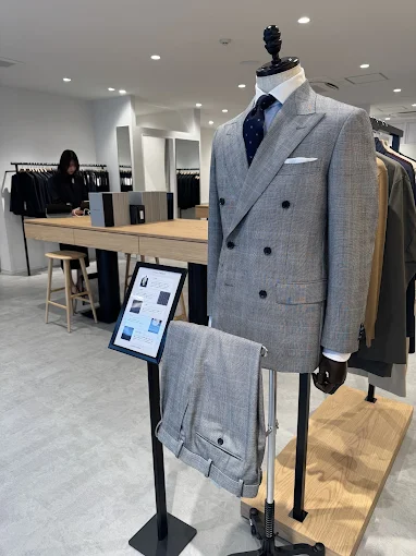 開放的で洗練された空間が特徴で、丁寧なスタッフのサポートにより、初めてのオーダースーツ選びも安心です。