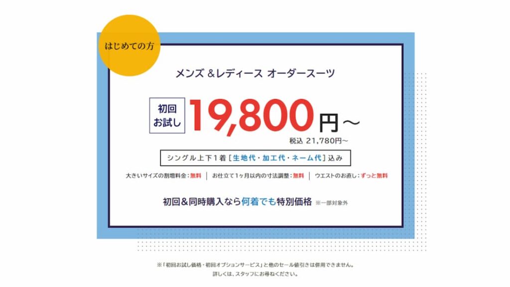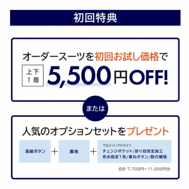 初回限定キャンペーンや豊富なオプション、生地グレードの幅広さによって、自分にぴったりの1着がきっと見つかります。