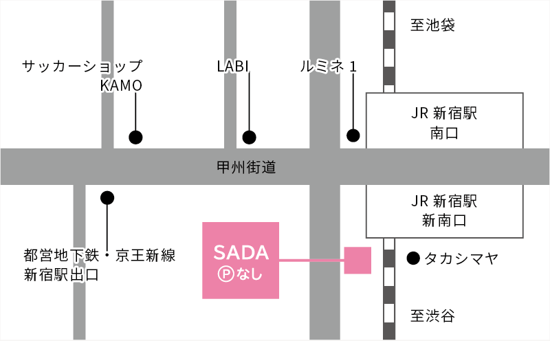 SADA 新宿南口店は、新宿駅から徒歩圏内の路面店で、買い物や仕事帰りにも立ち寄りやすい便利な立地が魅力。