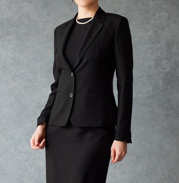 オーダーなら体型にぴったり合う美しいシルエットが叶い、深い黒の生地で礼節をしっかり演出。