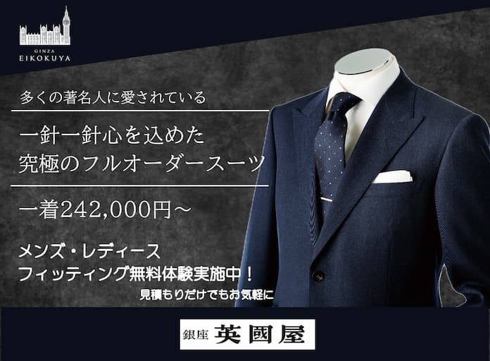 銀座英國屋![]() >> 公式サイト | ¥242,000~ (税込み) | フルオーダー 生地数10000種類以上 | 5店舗 | 来店 | 約2ヵ月~ | 体に完璧にフィットする究極フルオーダー 購入を前提としない無料フルオーダー体験 一顧客一担当制で長く信頼を築ける |