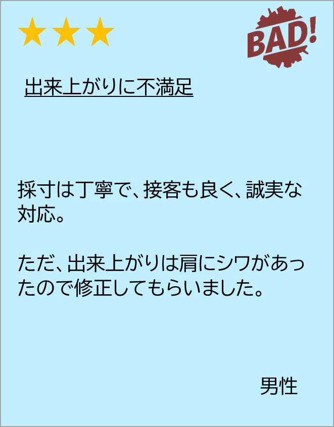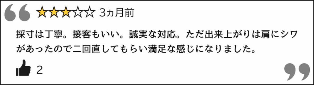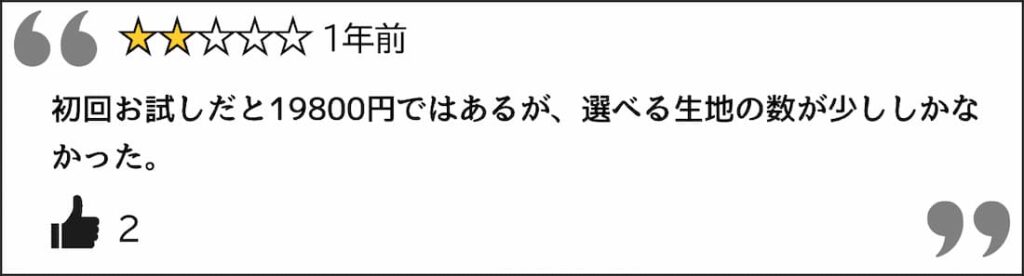 - 店舗での対面採寸が必要なので、近くに店舗がないと利用しにくい。