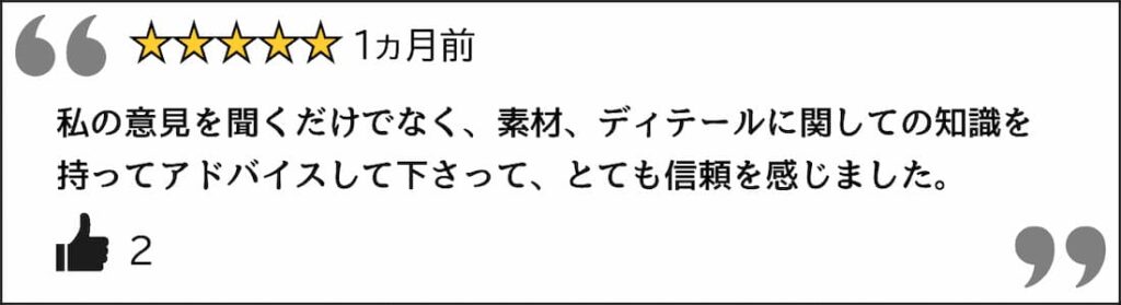 初めての方でも親切な対応と丁寧な採寸で、安心してオーダー可能。