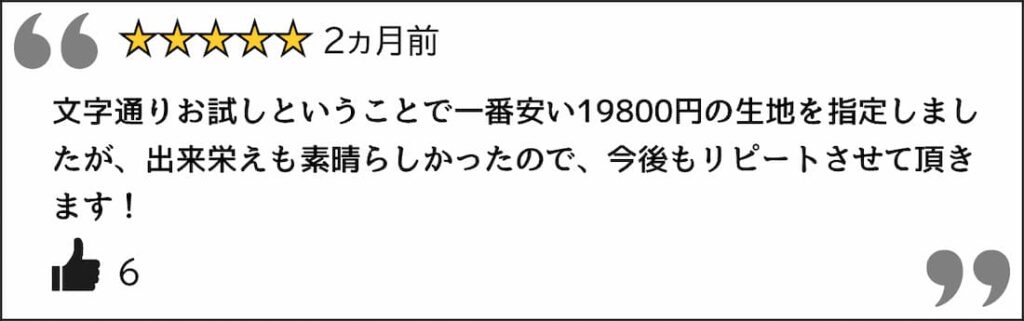 - 初回お試し価格が安いので、気軽にオーダースーツを体験できる。
