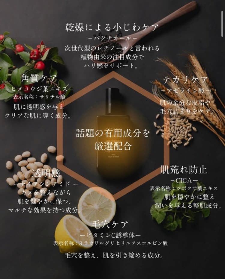 しかも成分には、次世代型レチノール「バクチオール」や、透明感と整肌効果に優れた「ナイアシンアミド」など、注目成分を贅沢に配合。