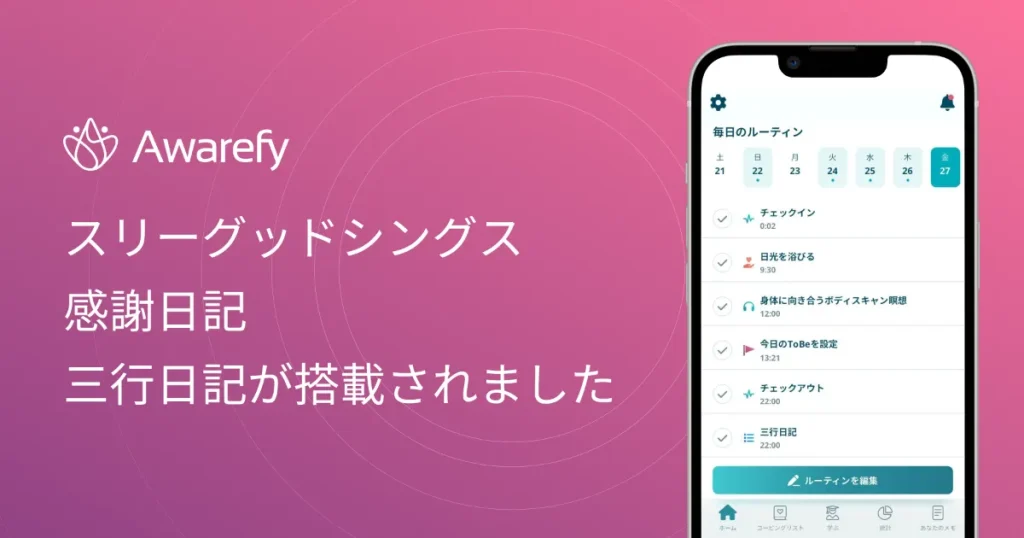 小さな幸せに気づく「スリーグッドシングス」や「三行日記」など自己肯定感を高めるポジティブ心理学ワークも搭載。