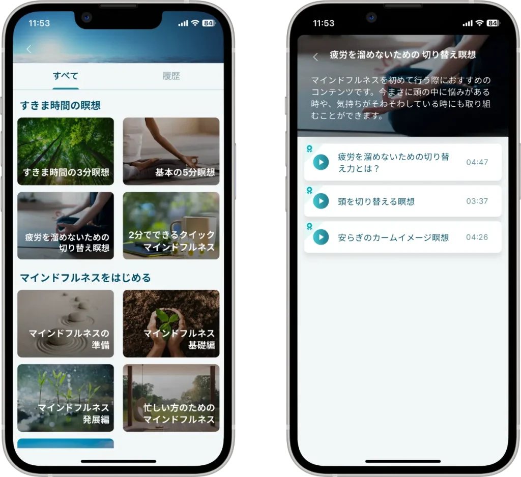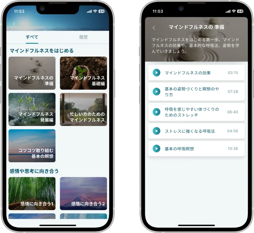 アプリ内には、呼吸法や瞑想など、日常に取り入れやすいプログラムが豊富に揃っています。