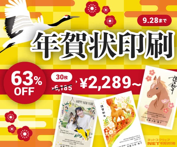 ネットスクェア![]() >>公式サイト | ・年賀状・喪中はがき印刷専門で実績16万件以上 ・デザインは1,100種類以上と業界トップクラス ・新規「のりかえ割」や60歳以上限定「シニア割」でお得 ・期間限定SALEや送料無料、宛名印刷無料など特典が充実 |