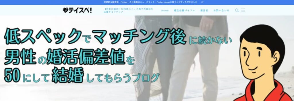 『テイスペ!』は、5年間の婚活の末結婚できた婚活アドバイザー「谷口テツ」さんが、同じようにモテない30代低スペック男性に向けて、婚活偏差値を50に上げて結婚してもらうための「弱者の婚活戦略」を発信しているメディアです。